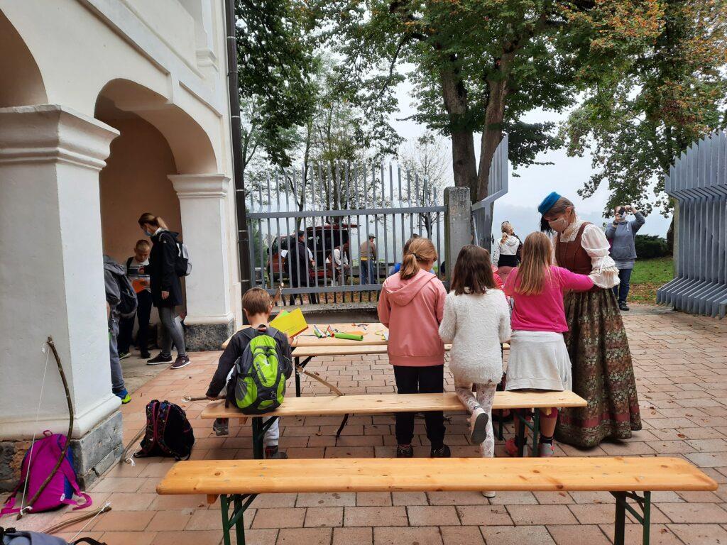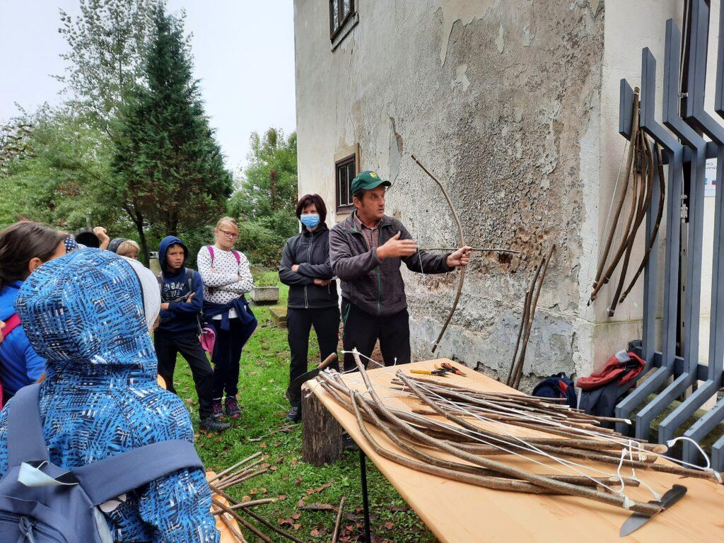 2. Skupina z rdečimi trakovi: Tu so se zbrali gostje lastnika dvorca in se podali na lov za divjimi živalmi, posebno veliko je bilo lisic. Za lov so uporabljali loke, zato si jih bomo tudi mi naredili iz pravih leskovih vej.